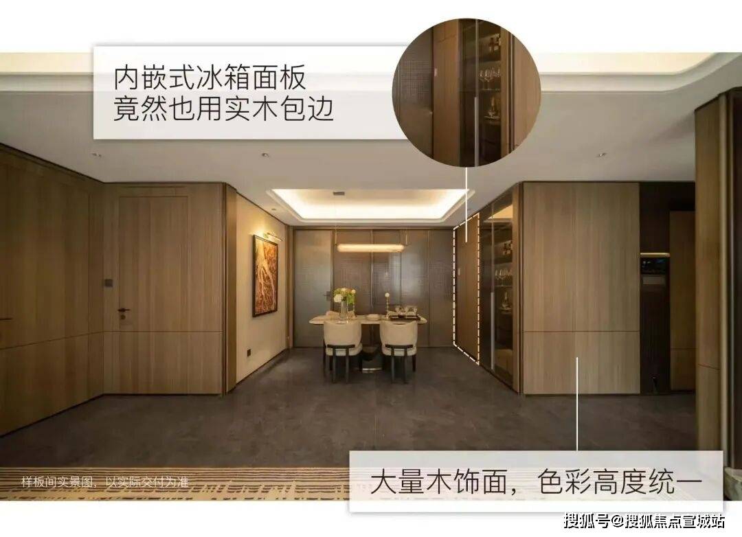 项目墙面铺设大量木饰面,相比墙布,更具质感更温馨。同时为了保持室内色调的统一,建面126㎡内嵌式冰箱的面板也采用木饰面。