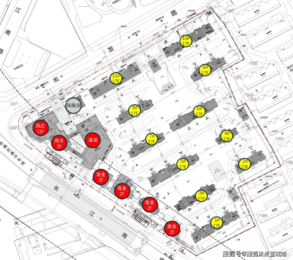 根据设计方案显示,项目拟建11栋12-18层可售住宅,总户数876户,可售住宅约807套;另需建设1栋保障性住宅房,靠近长江南路一侧规划有酒店、商业、菜场、社区食堂等业态。