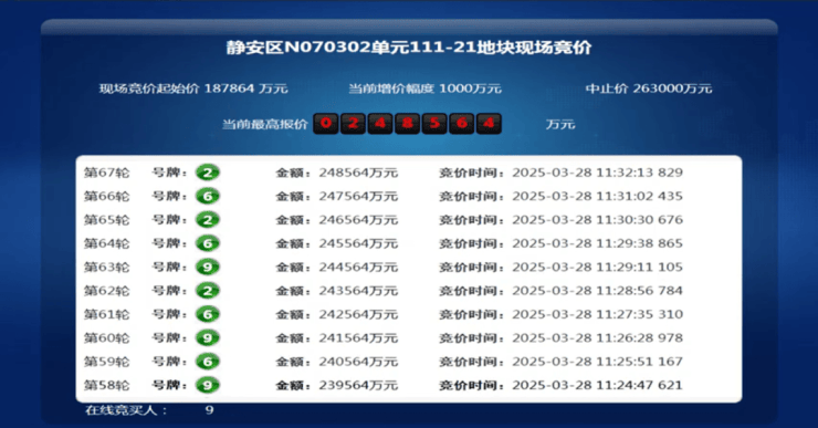 3月28日,上海2025年第三批次土拍,大华集团以总价24.85亿竞得静安大宁111-21地块,溢价率32.31%,折合楼板价92659元/㎡。装修标准不小于5000元/㎡。