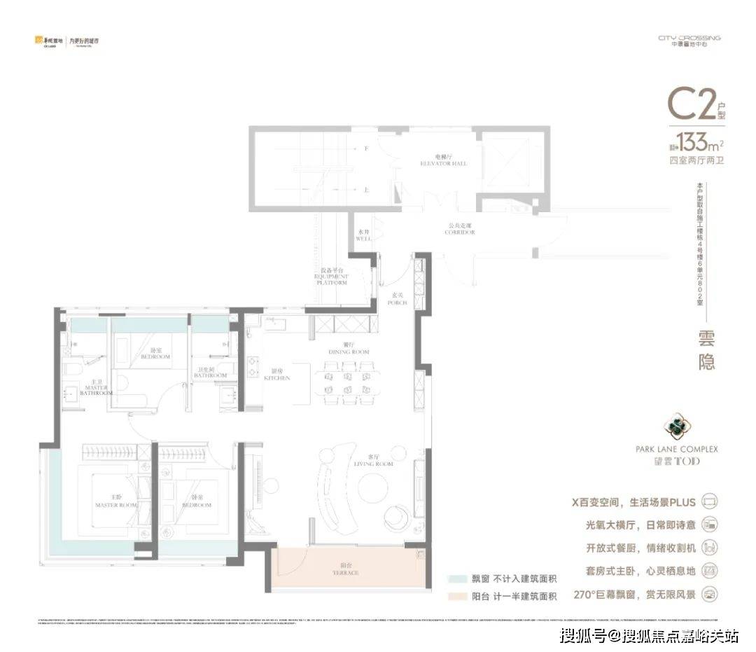 四开间朝南+豪华主卧的约270°无柱转角飘窗+横跨客厅和次卧的宽面阳台。